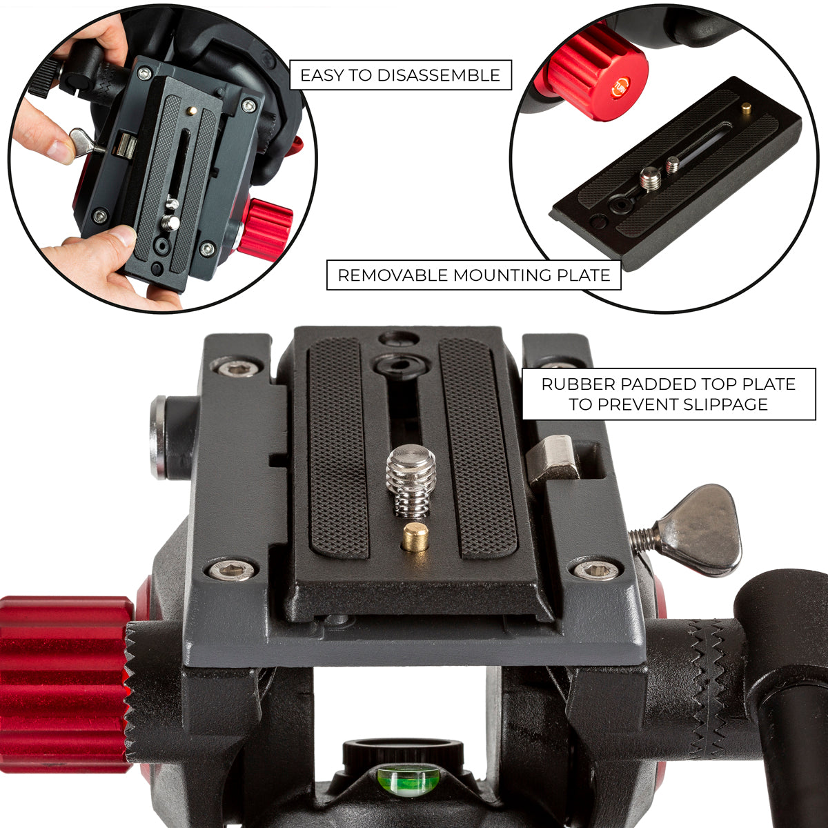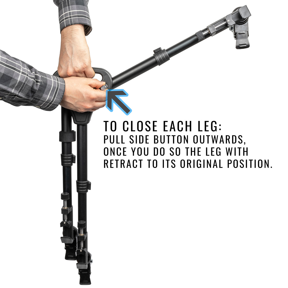 3 Abschnitte mit Teleskopbeinen und leicht zu verriegelnden Laschen für schnelles Aufstellen und Verstauen. 4 Grade fotografischer Freiheit: Ultraweiches Schwenken, Neigen für perfekte Panoramen, Höhenverstellung mit Zahnradknopf, 90-Grad-Schwenkkopf.