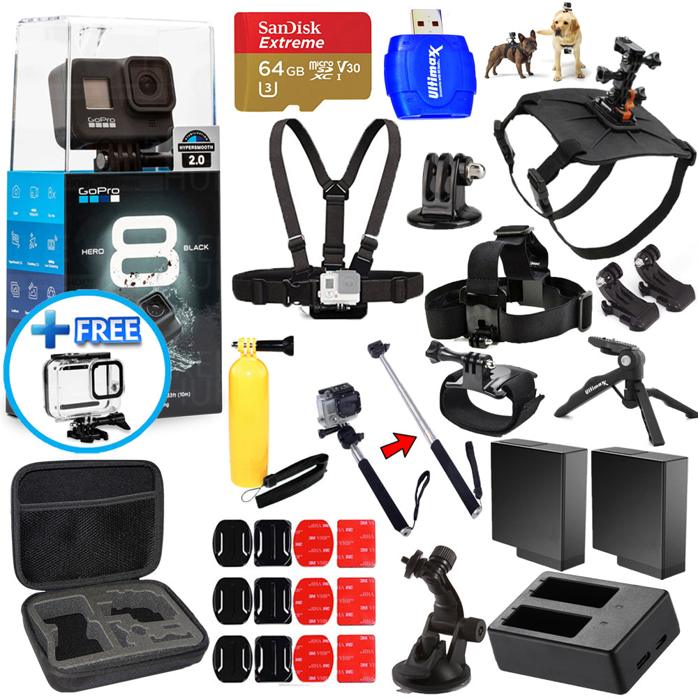 GoPro HERO8 HERO 8 Schwarz – All-in-1-MEGA-ZUBEHÖR-KIT + EXT-AKKU + 64 GB-Paket
