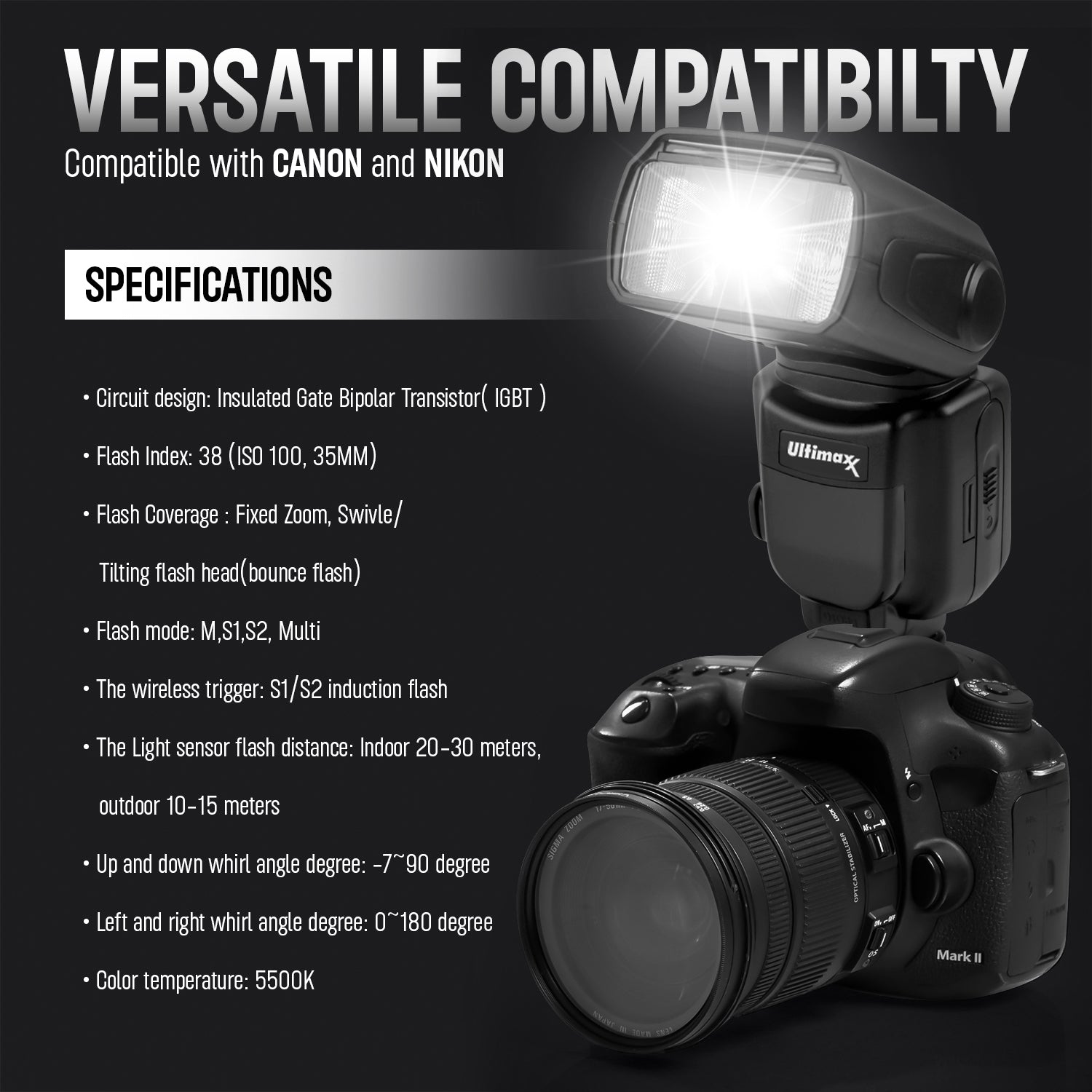 Erweiterter drahtloser Auslöser: Nutzen Sie den Induktionsblitz S1/S2 zum drahtlosen Auslösen mit einer Lichtsensor-Blitzreichweite von bis zu 30 Metern im Innenbereich und 15 Metern im Außenbereich.
