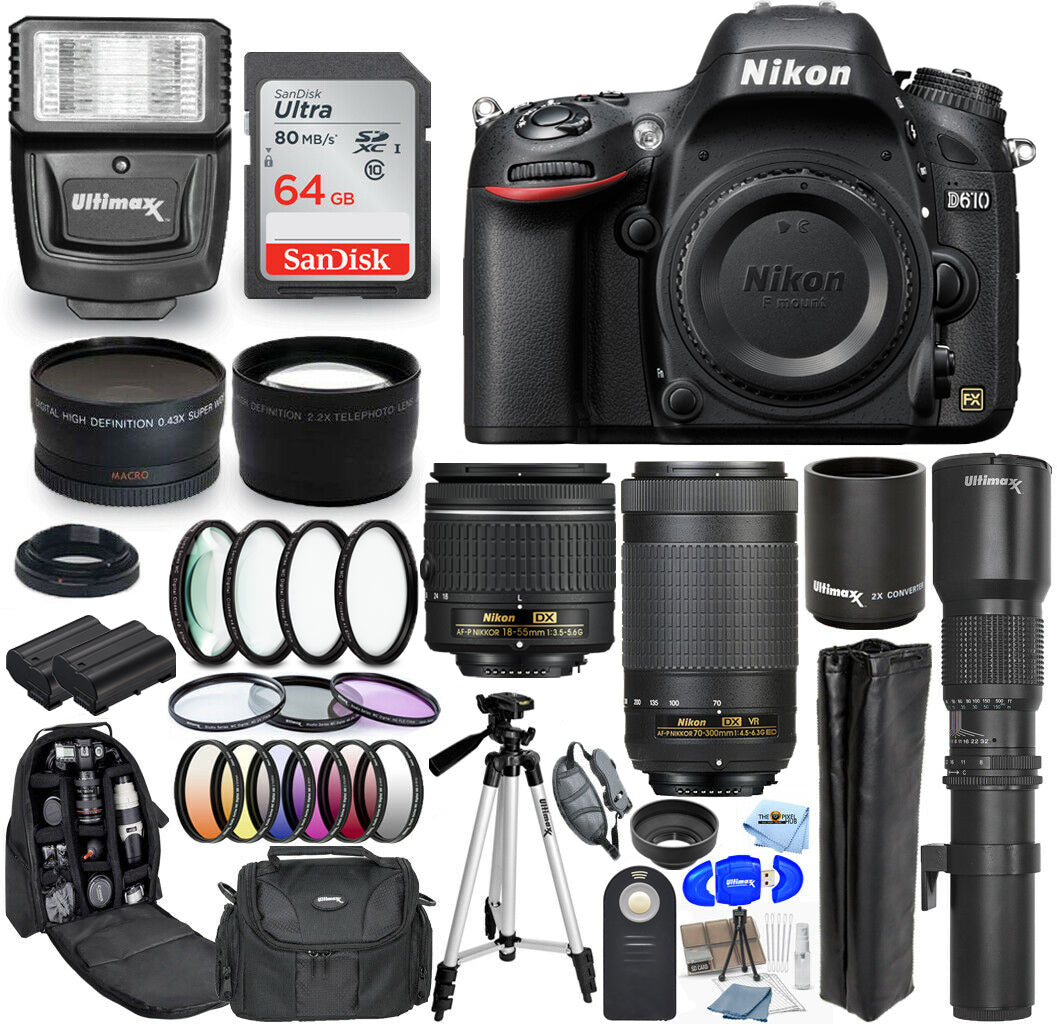 Nikon D610 Camera with 18-55mm + 70-300mm + 500mm Lenses - 30PC Accessory Bundle